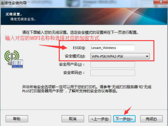 6、 輸入對應(yīng)的 WIFI 名稱和對應(yīng)無線網(wǎng)絡(luò)的加密方式,點(diǎn)擊下一步;
