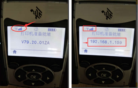 打印機(jī)自動重啟完成后會顯示有對應(yīng)的 WIFI 圖標(biāo)和對應(yīng)自動分配的 IP 地址,如下: